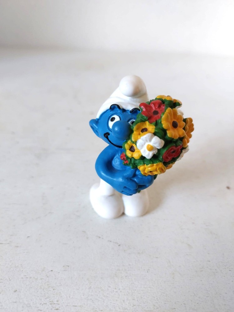 Strumf, Smurf cu flori, jucarie cauciuc , Schleich, Peyo, China, 5,5cm