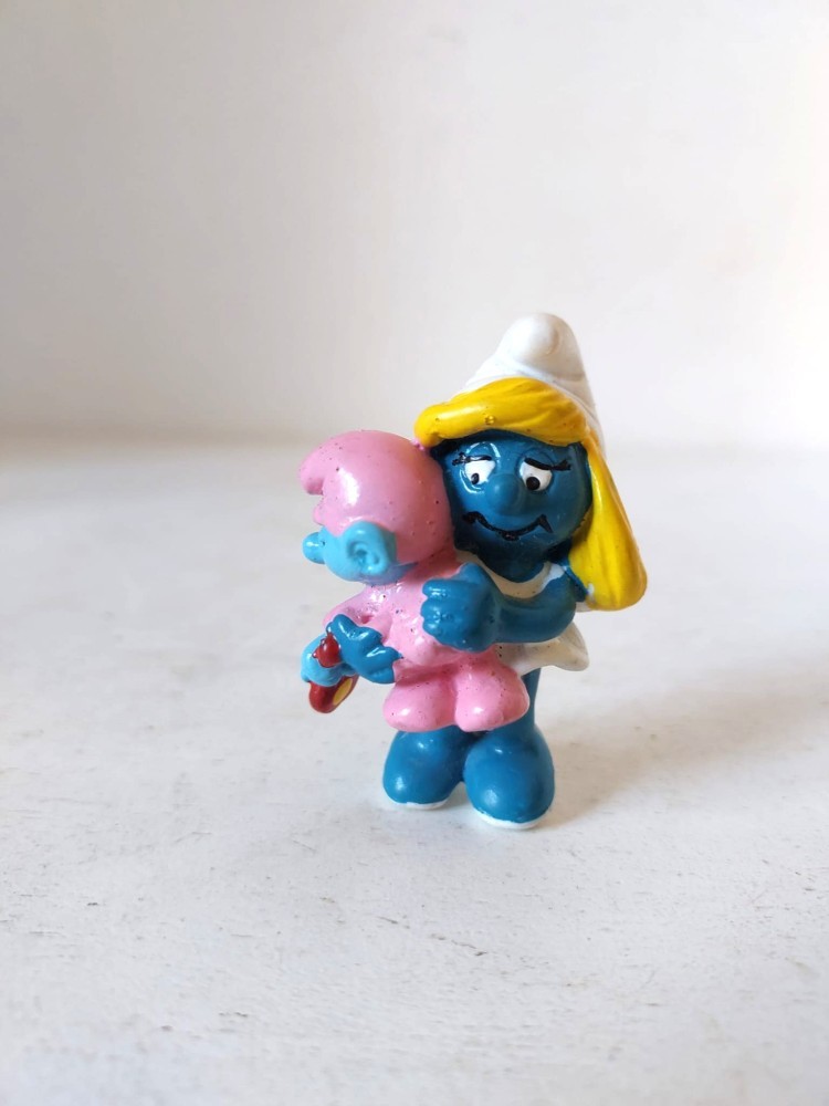 Strumf, Smurf fetita, Strumfita cu bebelus in brate, jucarie cauciuc, W. Germany 1983, 5,5cm