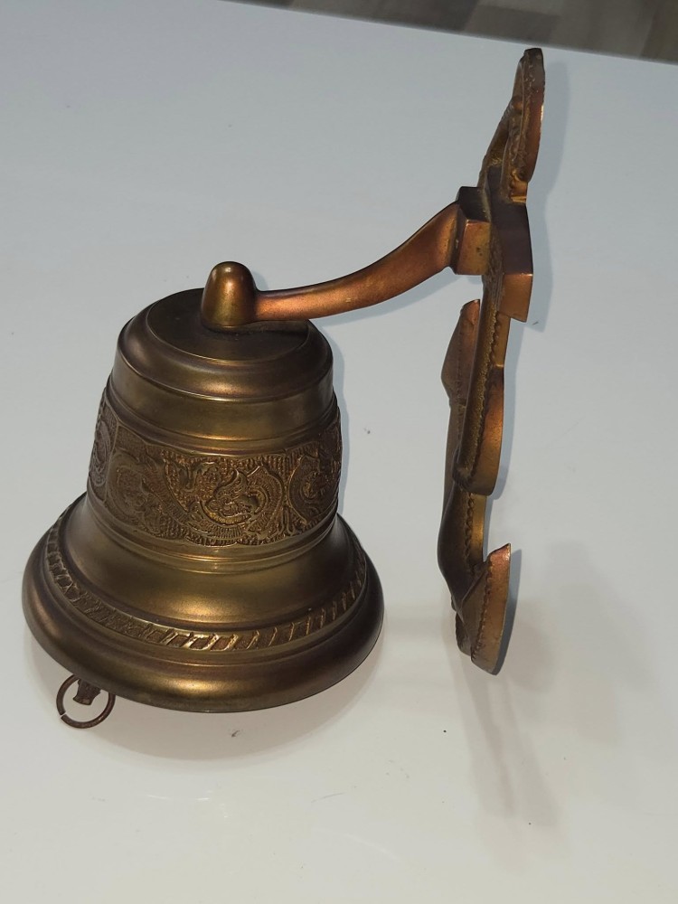 Superb clopot marinaresc, specific vapoarelor si avand atasata si o mica ancora. Material alama, functional. Inaltimea de 14,2 cm numai clopotul si greutatea totala de 1120 grame.