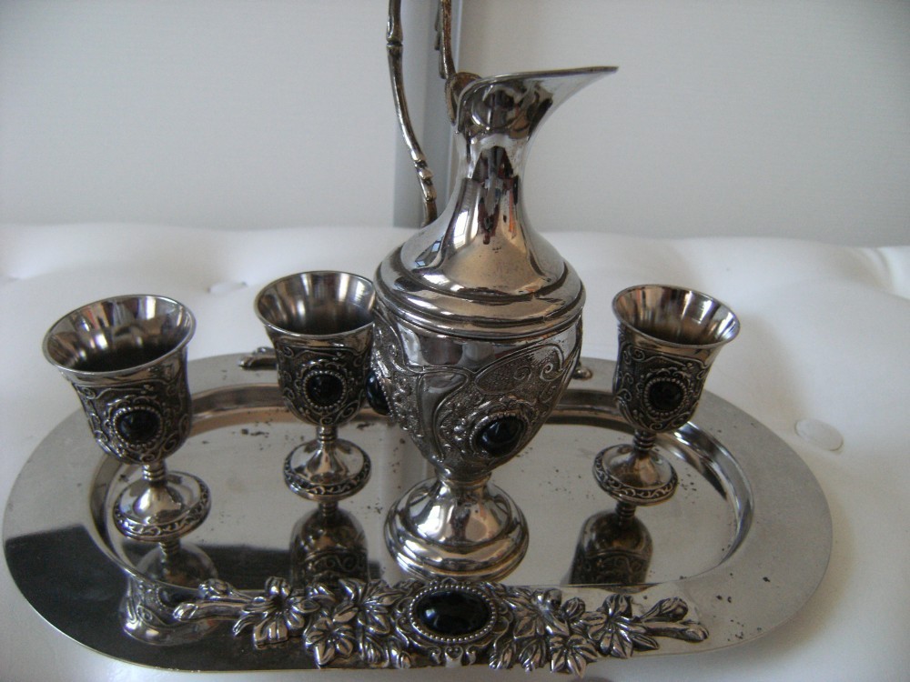 Superb set format din cinci piese, din alama argintata si pietre neagre pe fiecare piesa,cuprinde :3 pocale cu doua pietre fiecare, cu dimensiunile 7,5 x4,5 cm, o carafa cu patru pietre 18x10 cm, tava cu doua pietre 29x16,5 cm, lucrat superb, stare perfecta, de colectie/decor.