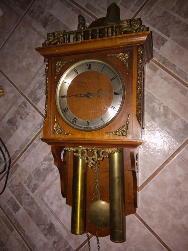 Superba pendula ,ceas de perete cu 2 greutati in stil francez cu elemente din bronz si statueta cu gong,stare foarte buna de functionare si estetica,batai pe clopotel de rezonanta la ore fixe si jumatati