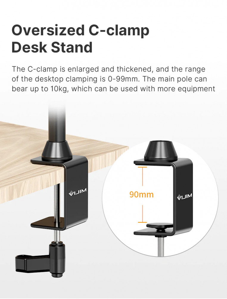 - Prindere sigura si confortabila cu clema mare tip C (mare si solida; permite o prindere in intervalul 0 -99mm). Bara principala suporta pana la 10 kg.