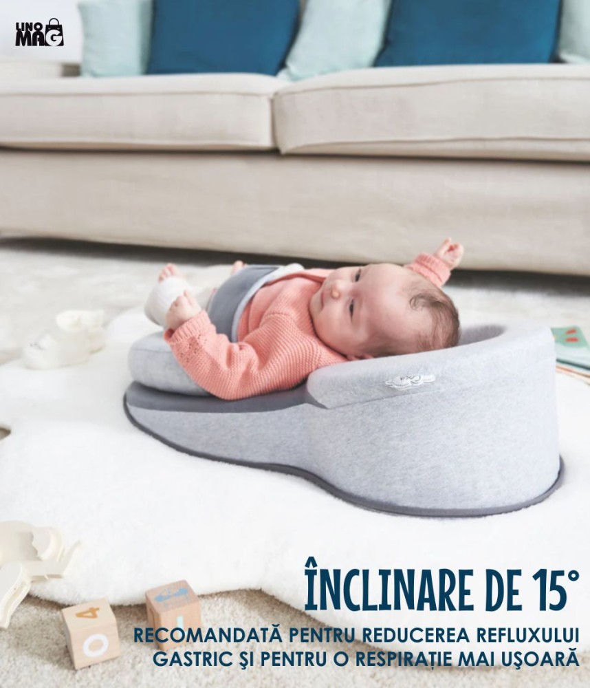 Suport Ergonomic Bebelusi pentru Somn cu Plan Inclinat 15° Anti-Reflux, Linomag®, Centură reglabilă, Suport picioare ajustabil, Perna pentru cap rotun
