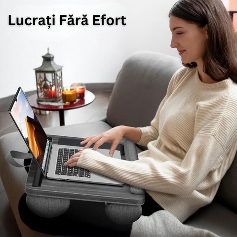🔹 Suport Laptop Multifuncțional cu Pernă, Mousepad & Suport Telefon/Tabletă – Negru/Gri 🔹