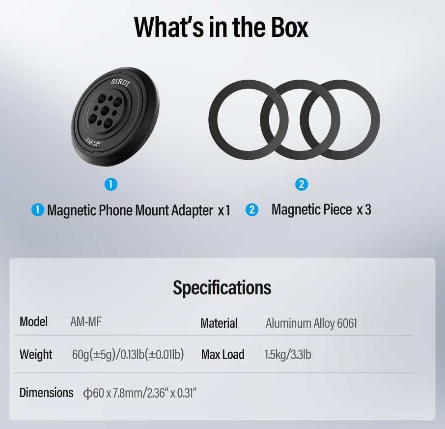 Suportul magnetic pentru telefon SIRUI AM-MF Magnetic Phone Mount este compact si usor cu doar 60 g, are un magnet puternic, sustinand pana la 1,5 kg.