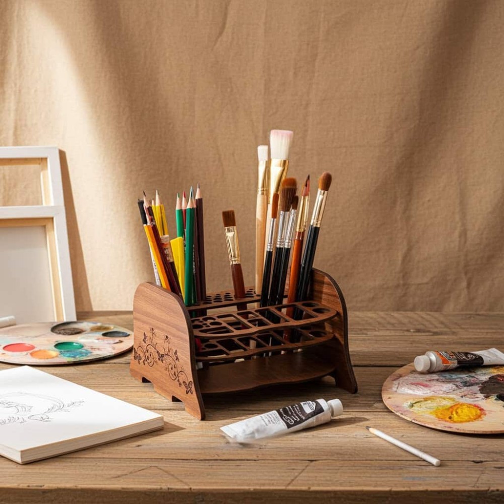 Suport pensule - prelungeste durata de viata a pensulelor si aranjeaza-le intr-un suport special dupa ce le-ai curatat.Suport pentru pensule, realizat din MDF 3mm prin taiere cu laser. Poate depozita pana la 52 de instrumente in poziție verticala.Suportul este prevazut cu 28 de orificii pentru pensule mici respectiv 17 orificii pentru pensule mari, este foarte stabil, perfect pentru a depozita pensule de diferite mărimi.Poate fi folosit si pentru depozitarea ordonata a creioanelor sau cariocilor,Dimensiune: L:12cm. l:6cm. h:9cm. Un suport de pensule din lemn decupat cu laser este un accesoriu elegant și practic, destinat artiștilor, pasionaților de pictură sau profesioniștilor din domeniul machiajului. Acesta combină precizia tehnologiei laser cu frumusețea naturală a lemnului, rezultând un obiect durabil, estetic și funcțional. Lemn de calitate. Grosimea materialului variază între 3-6 mm, asigurând o construcție rezistentă, dar ușoară. Suprafața poate fi finisată cu lac protector, ulei de lemn sau vopsea ecologică. Decupaj cu laser de înaltă precizie, ceea ce permite obținerea unor margini curate și fine. Orificii de diferite dimensiuni, pentru pensule subțiri și groase. Mai multe niveluri de organizare, permițând depozitarea pensulelor în funcție de dimensiune sau utilizare. Perfect pentru pictori, ilustratori, artiști de machiaj sau pasionați de DIY. Poate fi folosit în ateliere, studiouri, saloane sau acasă. Design ergonomic pentru acces rapid la pensule. Posibilitate de alegere a culorii și finisajului (lemn natural, închis, alb, etc.). Gravură personalizată cu nume, citate sau logo-uri. Modele ajustabile în funcție de preferințele utilizatorului. Acest suport de pensule reprezintă o combinație între estetică și funcționalitate, fiind atât un obiect decorativ, cât și un organizator eficient.