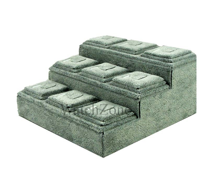 Expozor pentru inele de culoare gri, realizat din catifea pe o structura de lemn si burete. Are noua spatii pentru prezentarea inelelor sau a pandantivelor, organizate pe trei niveluri.