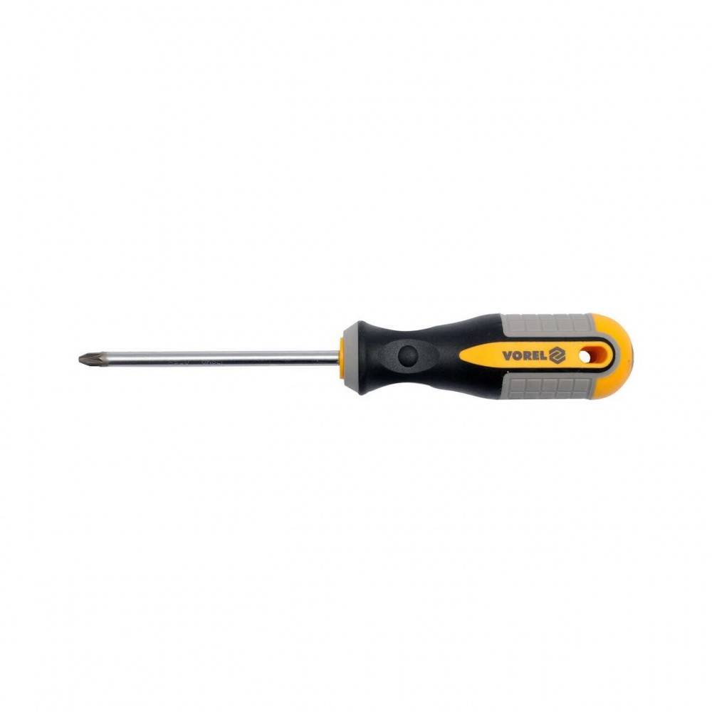 O șurubelniță Phillips PZ2x150 mm de Vorel 60937. Realizată din oțel crV-vanadiu CrV. Vârful are un finisaj satinat, suplimentar sablat și magnetizat, care permite o prindere fermă a capului șurubului. Mânerul este fabricat din plastic cu două compozite. Gaura din mâner vă permite să atârnați șurubelnița.