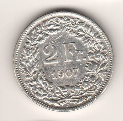 SV * Elvetia 2 FRANCS 1907 * ARGINT .835 +/- VF