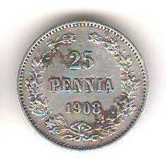 SV * Finlanda / ocup. Rusia tarista 25 PENNIA 1908 * ARGINT