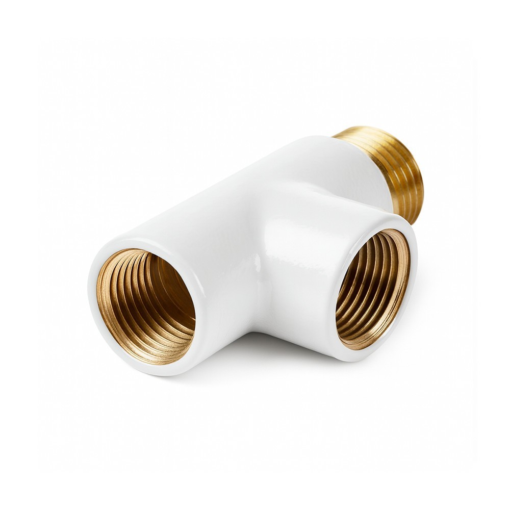 A T-idom masszív sárgaréz testből készül, amely garantálja a hosszú távú megbízhatóságot és a korrózióállóságot. A porszórt fehér bevonat nemcsak esztétikus, hanem ellenáll a hőnek és a nedvességnek is, így a termék éveken át megőrzi hibátlan állapotát.