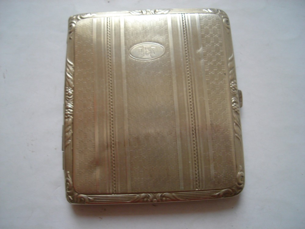 Tabachera veche din alpaca, stare buna, cca. 9x8 cm, curata. Are doua mici lovituri pe partea din fata unde are o monograma. In interior are o urme de frecare, cineva a incercat-o daca nu e argint. Balamalele sunt OK!