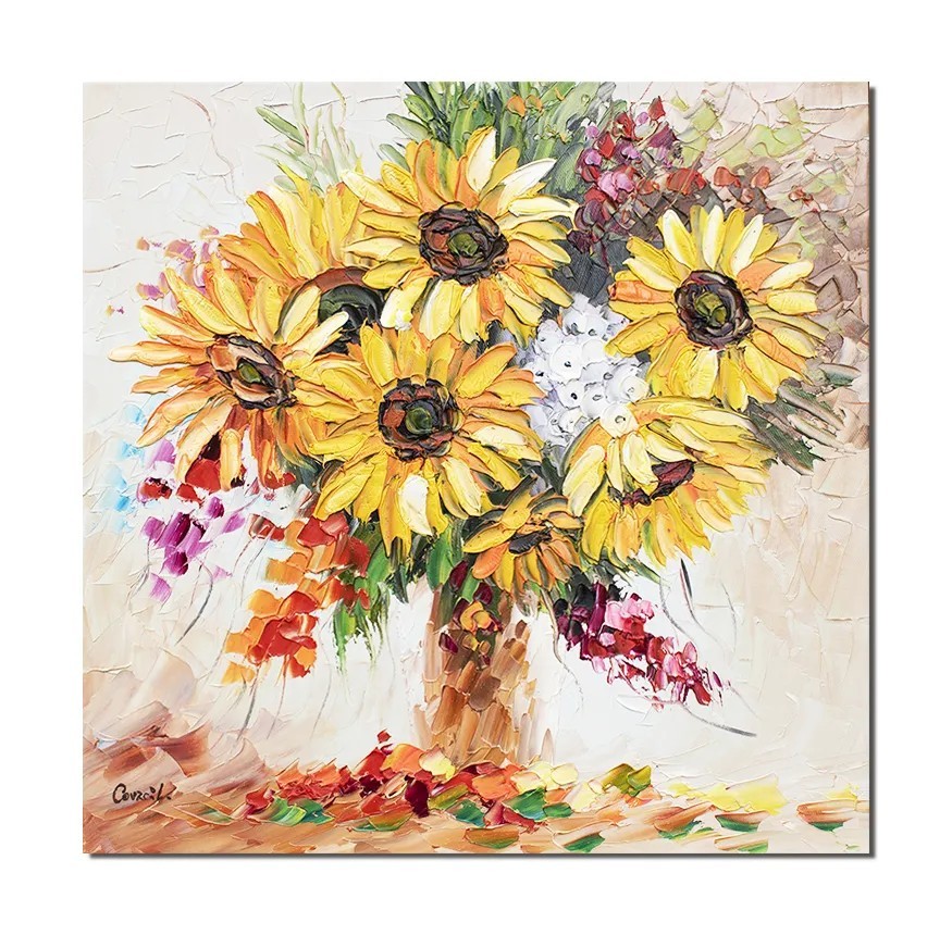 Tablou 3D Vaza cu floarea soarelui pictat manual, 50x50cm ulei pe panza, Leonard Covaci
