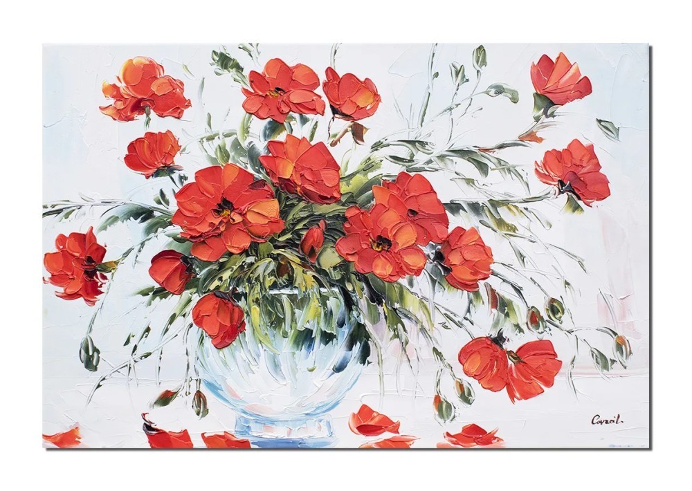 Tablou 3D vaza cu maci regali pictat manual, 60x40cm ulei pe panza in cutit, Leonard Covaci