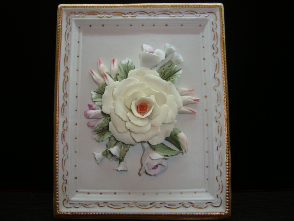 SUPERB TABLOU / APLICA DIN PORTELAN CU MODEL 3 D,DECORATA CU TRANDAFIR,ACESTA PREZINTA LA 2 PETALE DEFECTE DUPA CUM SE POATE OBSERVA DIN POZELE POSTATE. APLICA ARE DIMENSIUNILE DE 21,5 X 17 CM SI ARE SISTEM DE AGATARE PE PERETE.