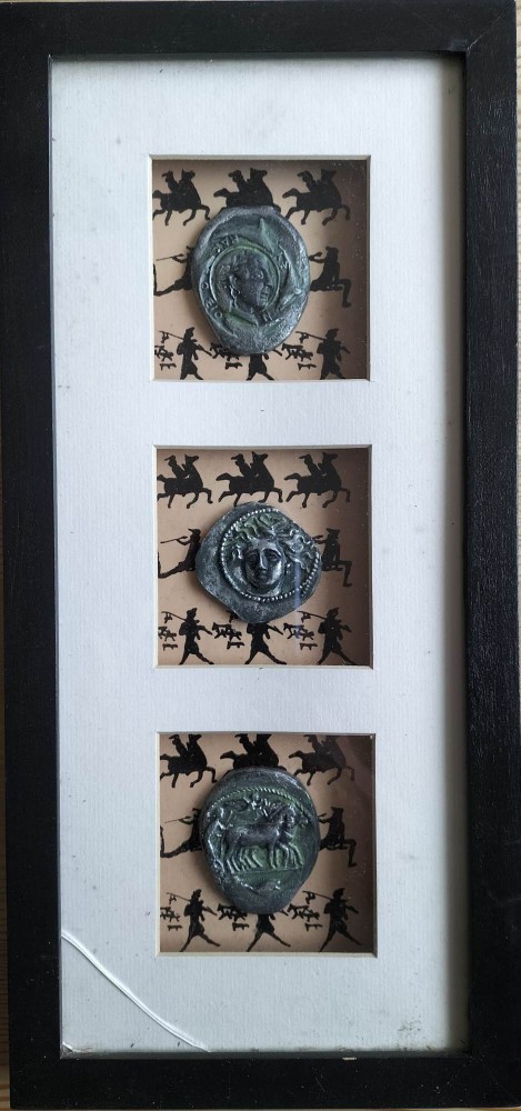 Tablou, cu 3 imitaţii de monede antice greceşti