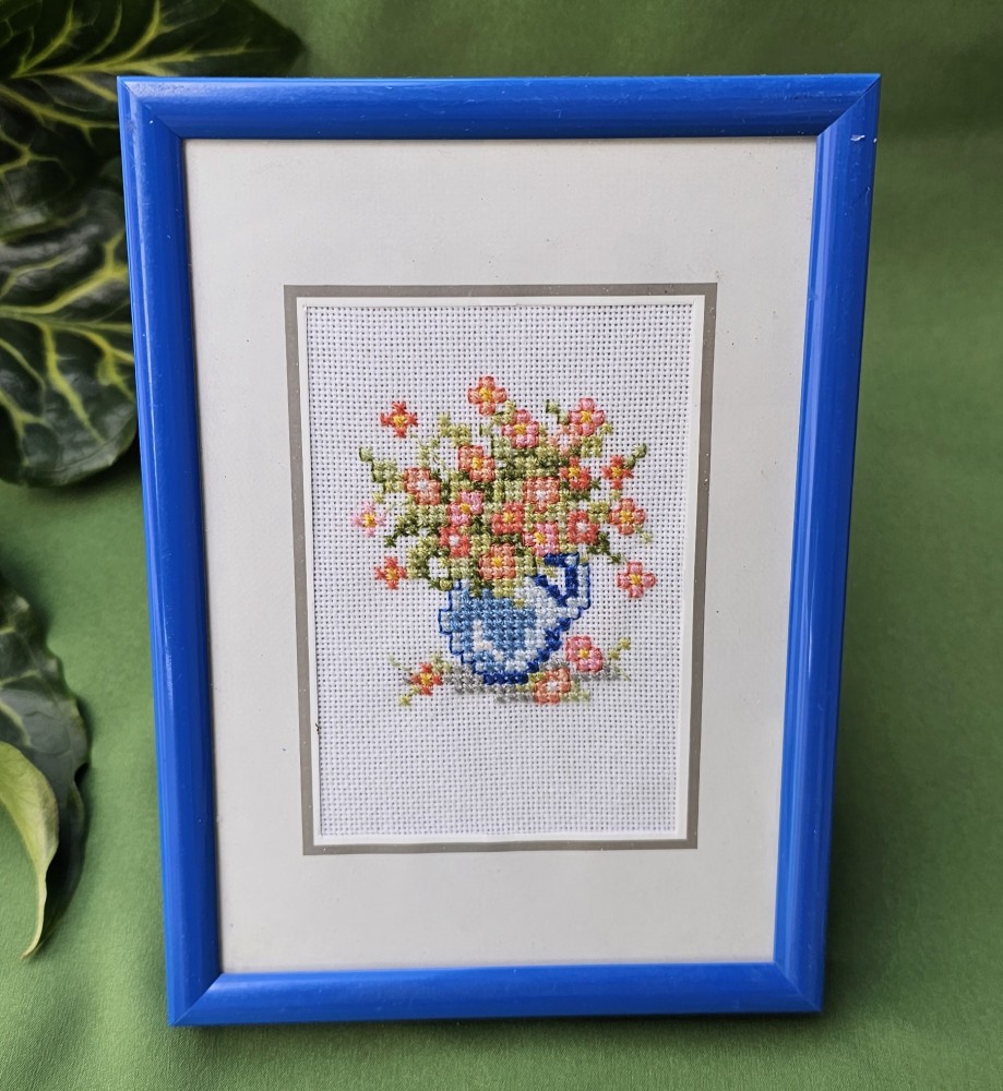 TABLOU CU IMAGINE GOBLEN CUSUT MANUAL, PROTECȚIE GOBLEN SI RAMA DIN PLASTIC IN CULOAREA ALBASTRA.