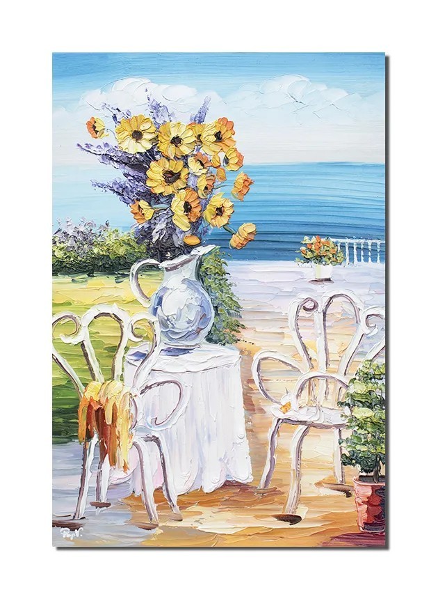 Tablou floarea soarelui pictat manual, O zi minunata la malul marii, 60x40cm ulei in cutit efect 3D, Valentin Pop