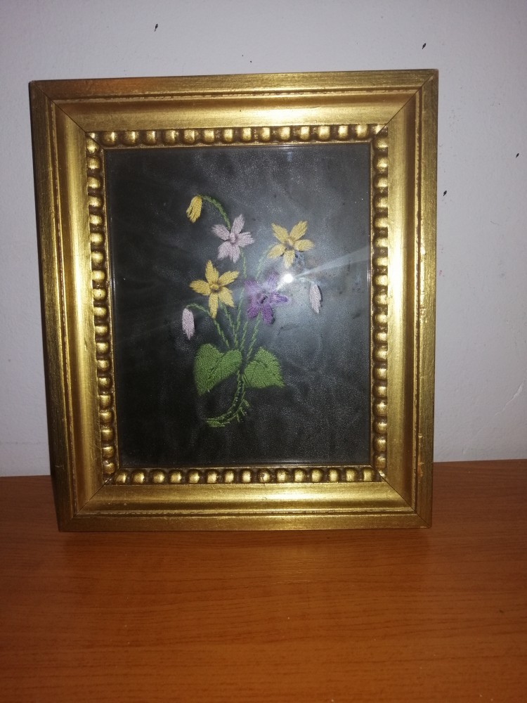 Tablou floral cusut brodat pe matase neagra broderie cu fir de matase veche 18.5 x 16 cm rama lemn, sticla protectie