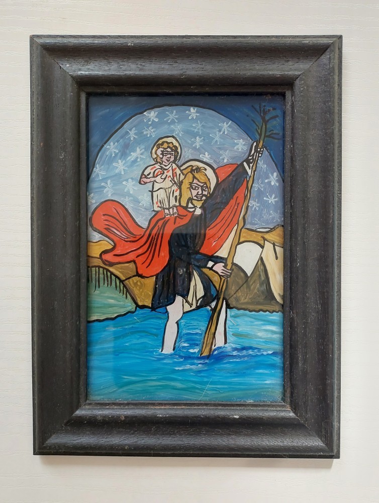 Tablou icoana pe sticla stil naiv, rama lemn, Sfantul mucenic Hristofor, 1982