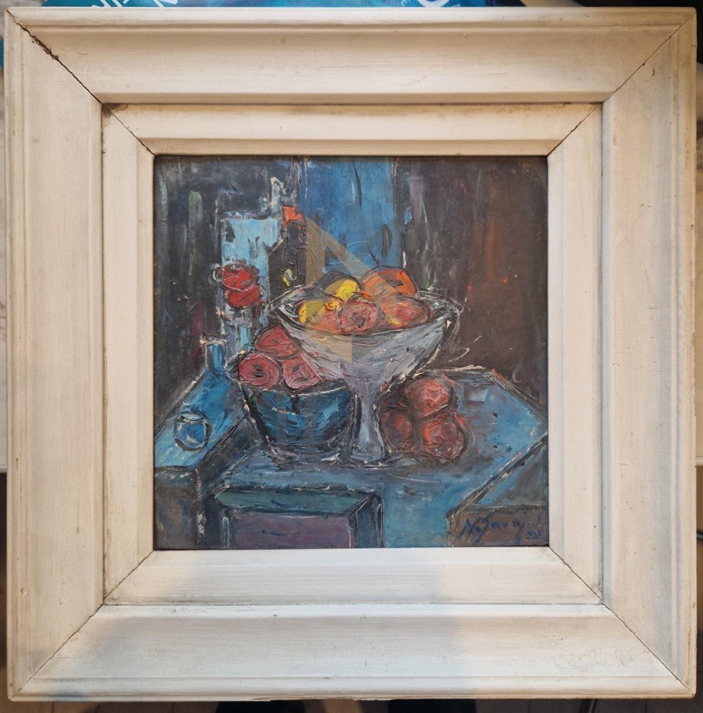 Natura statica cu fructe, semnat si datat dreapta jos, cu albastru N. Savopol (19)91, Dim - 20 x 20 cm Nicolae Savopol jr ( n, 1938 ) Verso dedicatia artistului.