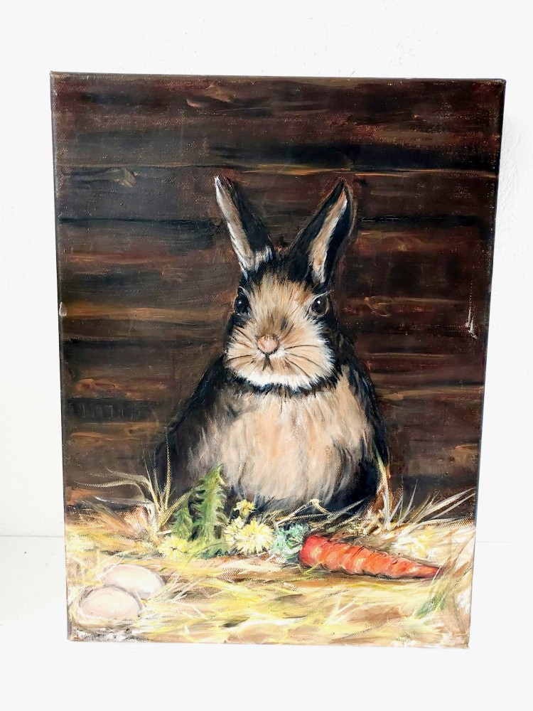 Lucrare in ulei pe panza, reprezentand un iepure asezat pe un strat de fan, inconjurat de un morcov, doua oua si o papadie. Compozitia este tratata in stil realist, cu accent pe texturile naturale si detaliile anatomice ale animalului. Tonurile calde si lumina blanda sugereaza o scena linistita de inspiratie pastorala. Tabloul nu este semnat, dar este datat 2019 pe lateral. Panza este intinsa pe un cadru din lemn.