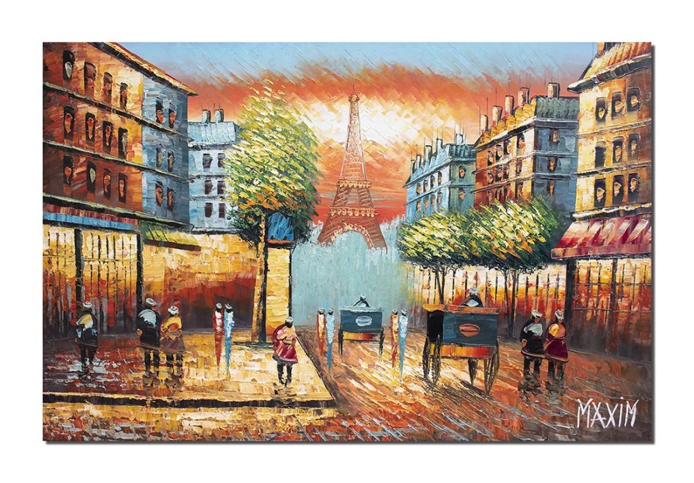 Tablou Paris pictat manual, Vedere cu turnul Eiffel, 90x60cm ulei pe panza in cutit efect 3D