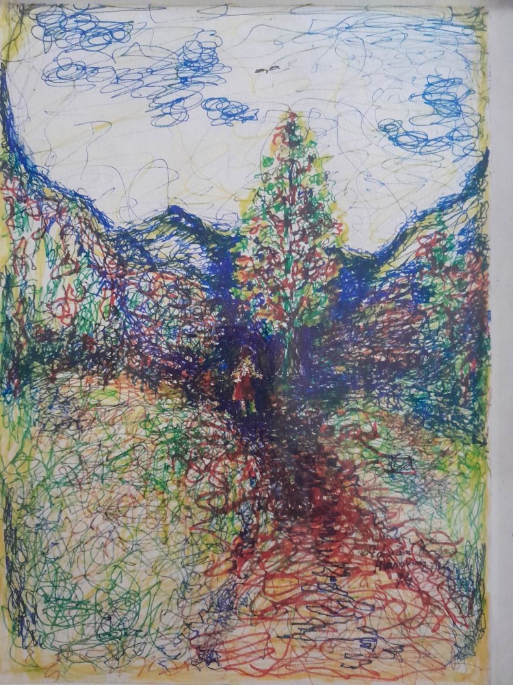 tablou Peisaj, tehnica mixta, acuarela si carioca, Adrian Hurmuz