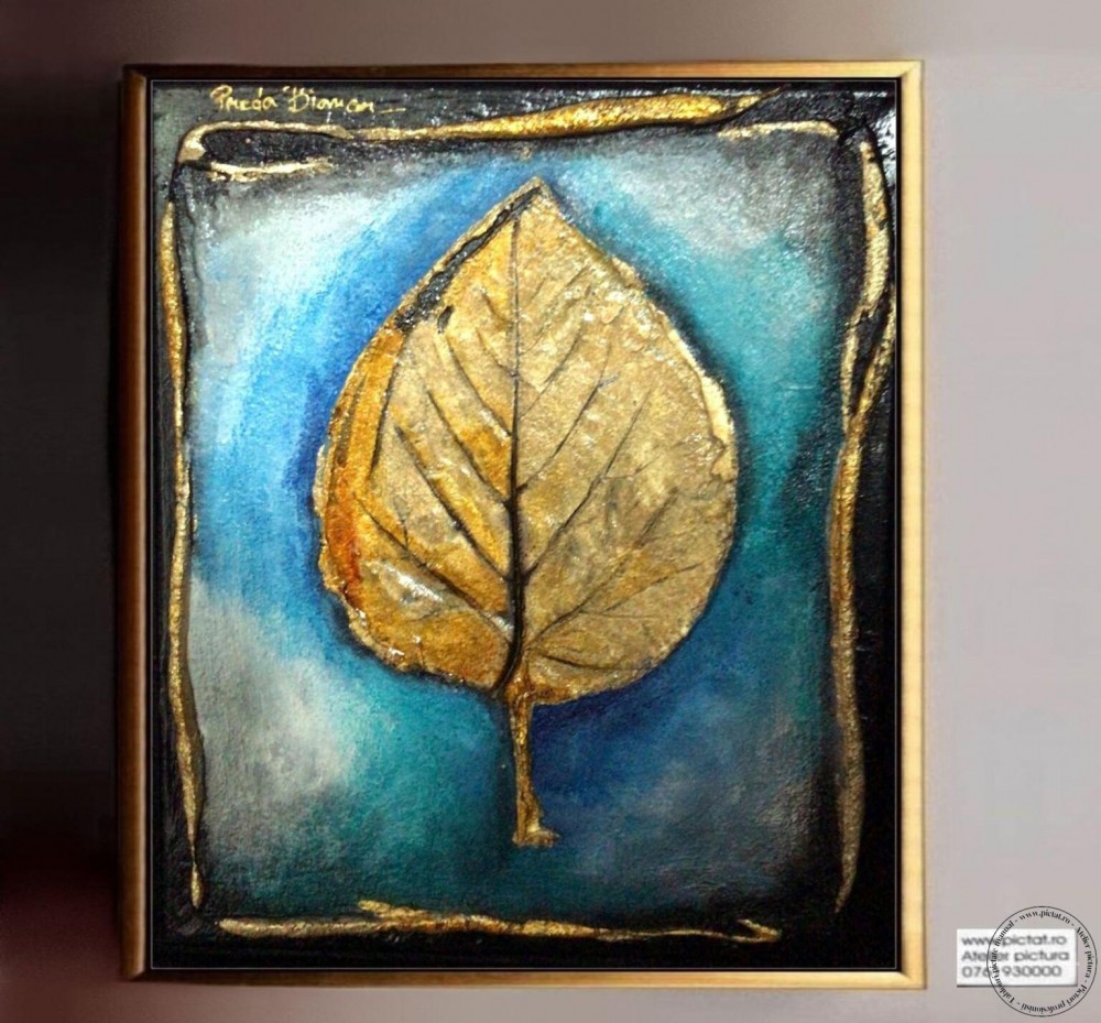 TABLOURI PICTATE MANUAL TABLOU FRUNZE TROPICALE, TABLOU ABSTRACT FRUNZA AURIE, TABLOU AURIU 30X40CM.