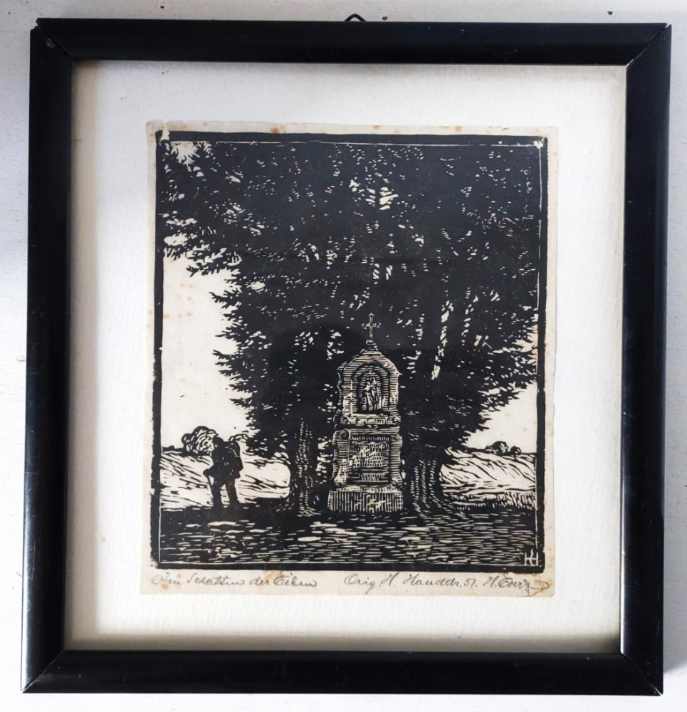 Scenă rural-religioasă central-europeană: un mic altar/icoană votivă cu Sf. Sebastian pe un soclu de piatră, amplasat într-o poieniță sub copaci înalți; în stânga, silueta unui țăran cu coș în spinare. Tăietura este energică, cu suprafețe negre compacte și nerv de linie specific xilogravurii de atelier din anii ’40–’50.