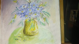 Tablou pictat manual în ulei pe panza ,reprezentând flori de culoare alb,albastru într o vaza.(20x20)