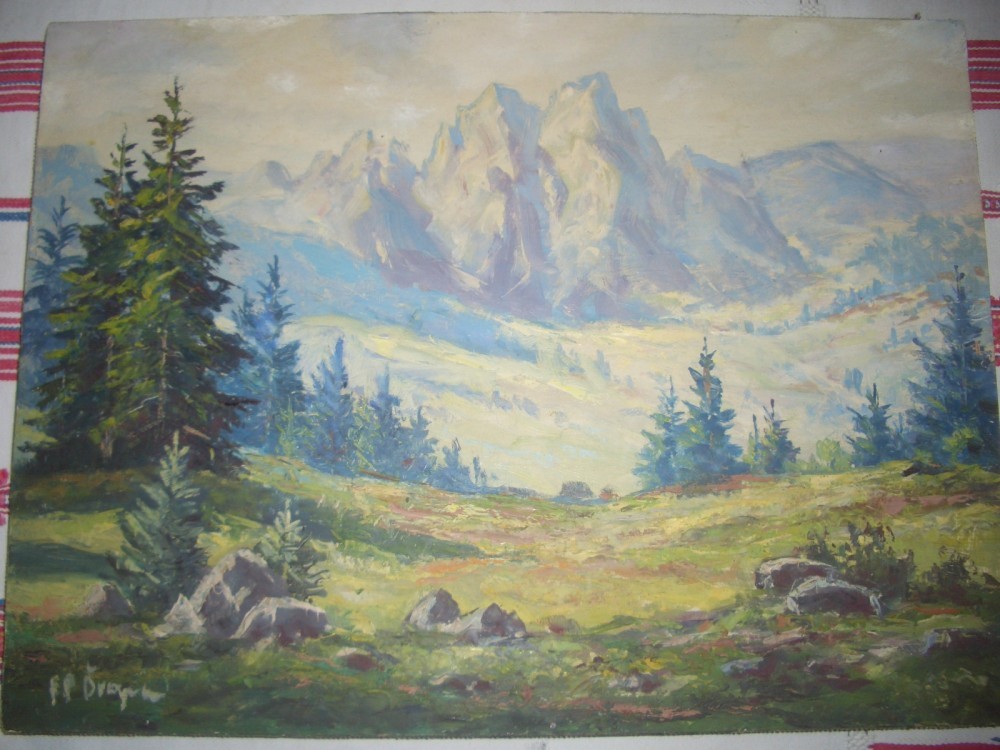 ulei pe panza dublata pe carton, 40/30 cm, reprezentand peisaj montan, provenienta din Austria, semnatura indescifrabila, stare foarte buna, nu necesita curatare sau restaurare.