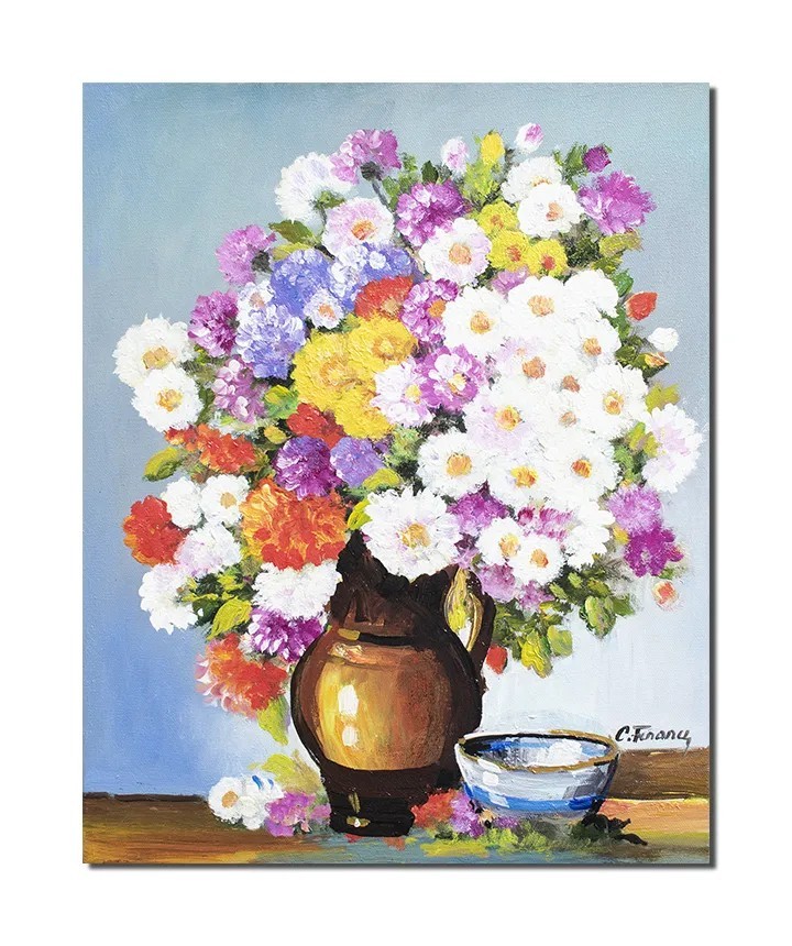 Tablou vaza cu crizanteme colorate pictat manual Din gradina bunicii, 50x40cm ulei pe panza, Constantin Feraru