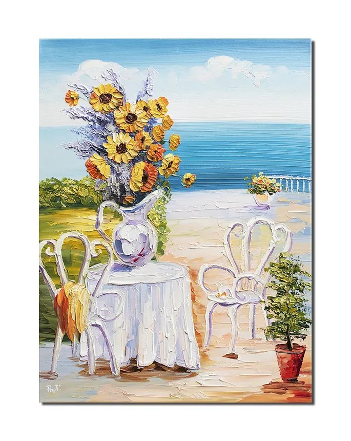Tablou vaza floarea soarelui pictat manual, O zi minunata la malul marii, 70x50cm ulei in cutit efect 3D, Valentin Pop