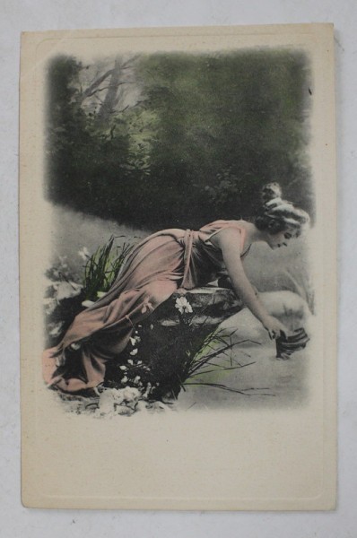 TANARA CU ROCHIE ROZ , LA RAU , CARTE POSTALA ILUSTRATA , COLORIZATA , CLASICA