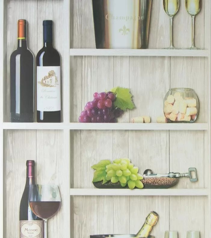 Tapet tematic pentru bucatarie, cu sticle, struguri, multicolor, spuma vinilica, textura cauciucata, lavabil, pe suport de hartie. Dimensiune rola; 53cm x 10m. La acest model de tapet este nevoie de un adeziv special (pentru suport de hartie) care se va aplica si pe perete si pe tapet. Pentru pregatirea suprafetei este necesara amorsarea peretilor cu amorsa acrilica pentru o lipire uniforma si de lunga durata.