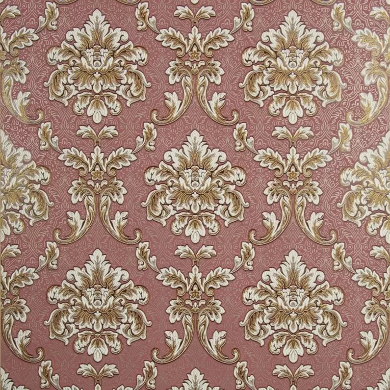Tapet clasic, fond visiniu deschis, flori baroc cu sclipici auriu fin, spuma vinilica, lavabil, pe suport de hartie. Dimensiune rola: 53cm x 10m. La acest model de tapet este nevoie de un adeziv special (pentru suport de hartie) care se va aplica si pe perete si pe tapet. Pentru pregatirea suprafetei este necesara amorsarea peretilor cu amorsa acrilica pentru o lipire uniforma si de lunga durata.