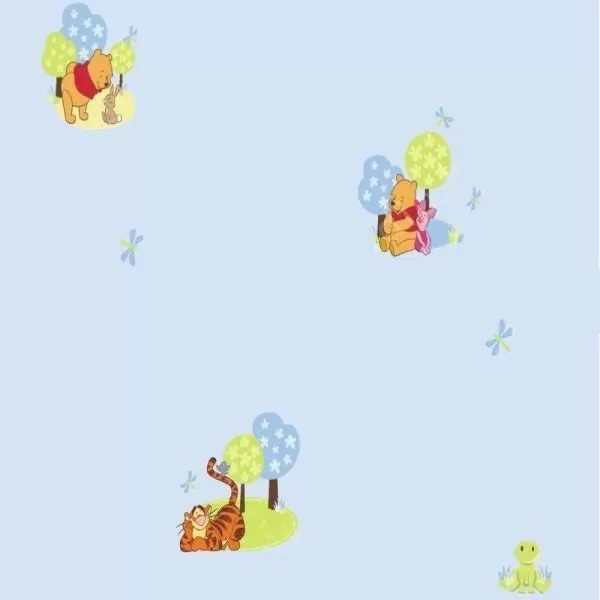 Tapet pentru copii pe fond albastru cu Winnie, hartie, semilavabil, dimensiune rola; 53cm x10m. La acest model de tapet este nevoie de un adeziv special (pentru suport de hartie) care se va aplica si pe perete si pe tapet. Pentru pregatirea suprafetei este necesara amorsarea peretilor cu amorsa acrilica pentru o lipire uniforma si de lunga durata.