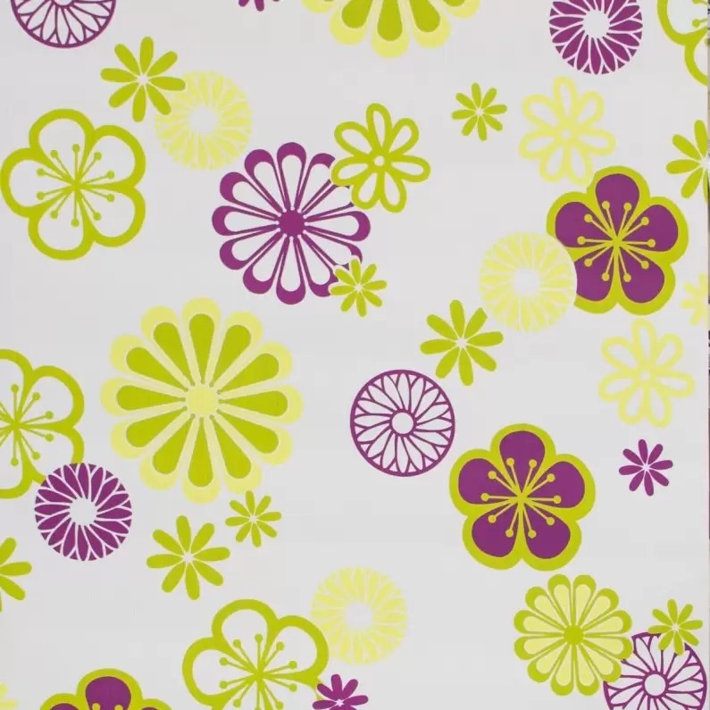 Tapet floral, fond alb cu striatii in textura, flori pe mov si verde, hartie, semilavabil, pe suport de bumbac netesut (vlies). Dimensiune rola: 53cm x 10m. La acest model de tapet este nevoie de un adeziv vlies (pentru suport de bumbac) care se va aplica doar pe perete. Pentru pregatirea suprafetei este necesara amorsarea peretilor cu amorsa acrilica pentru o lipire uniforma si de lunga durata.