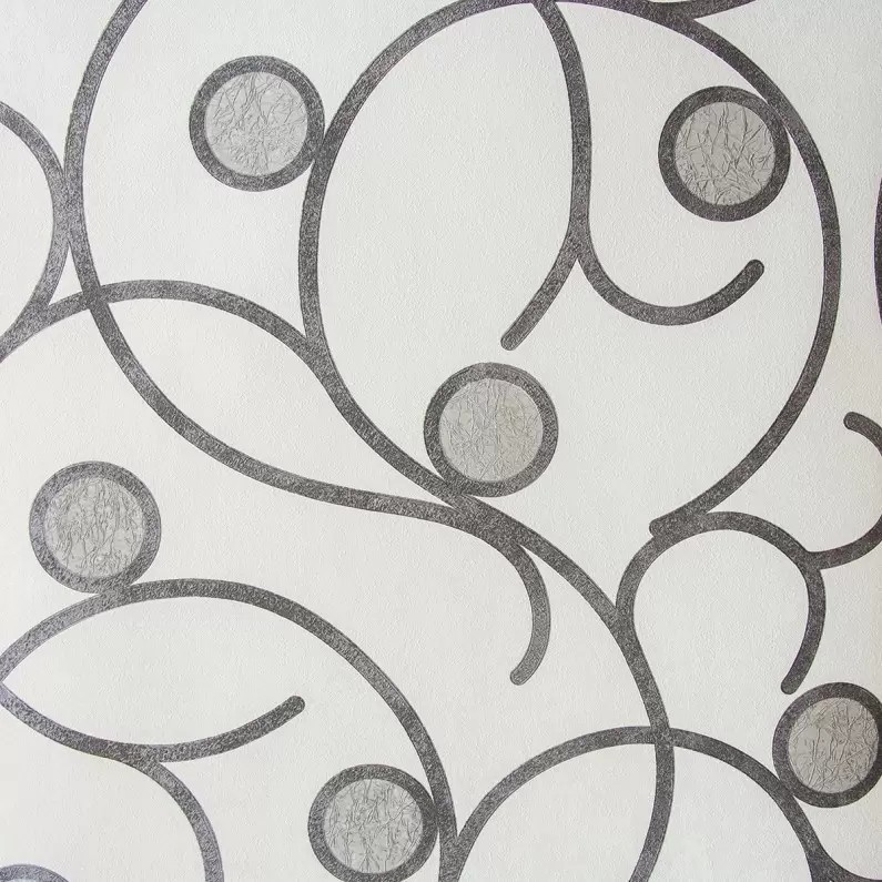 Tapet modern, fond alb, model cu linii pe negru si cerculete pe gri-argintiu, texturat, vinil compact, extralavabil, pe suport de bumbac netesut (vlies). Dimensiune rola: 53cm x 10m. La acest model de tapet este nevoie de un adeziv vlies (pentru suport de bumbac) care se va aplica doar pe perete. Pentru pregatirea suprafetei este necesara amorsarea peretilor cu amorsa acrilica pentru o lipire uniforma si de lunga durata.