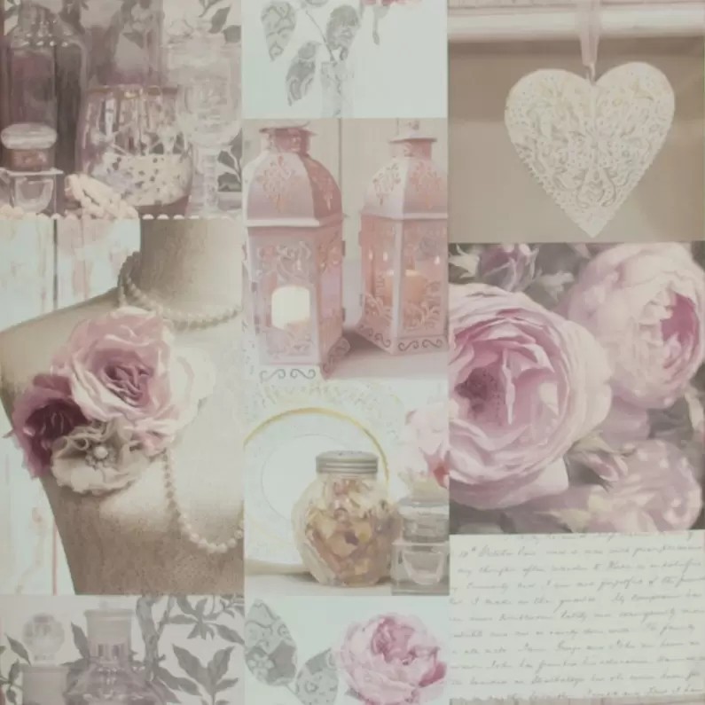 Tapet tematic cu flori, scrisuri, sticle, roz, alb, crem, bej, gri, hartie, semilavabil, pe suport de hartie. Dimensiune rola: 53cm x 10m. La acest model de tapet este nevoie de un adeziv special (pentru suport de hartie) care se va aplica si pe perete si pe tapet. Pentru pregatirea suprafetei este necesara amorsarea peretilor cu amorsa acrilica pentru o lipire uniforma si de lunga durata.