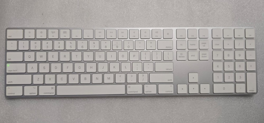 Magic Keyboard with Numeric Keypad features an extended layout, with document navigation controls for quick scrolling and full-size arrow keys for gaming. A scissor mechanism beneath each key allows for increased stability, while optimized key travel and a low profile provide a comfortable and precise typing experience. The numeric keypad is also great for spreadsheets and finance applications. And the built-in, rechargeable battery is incredibly long-lasting, powering your keyboard for about a month or more between charges.1
