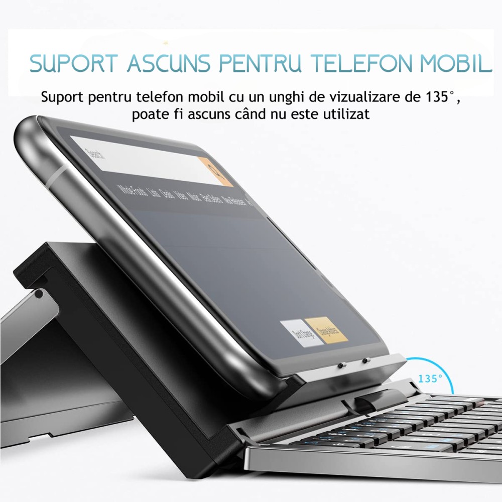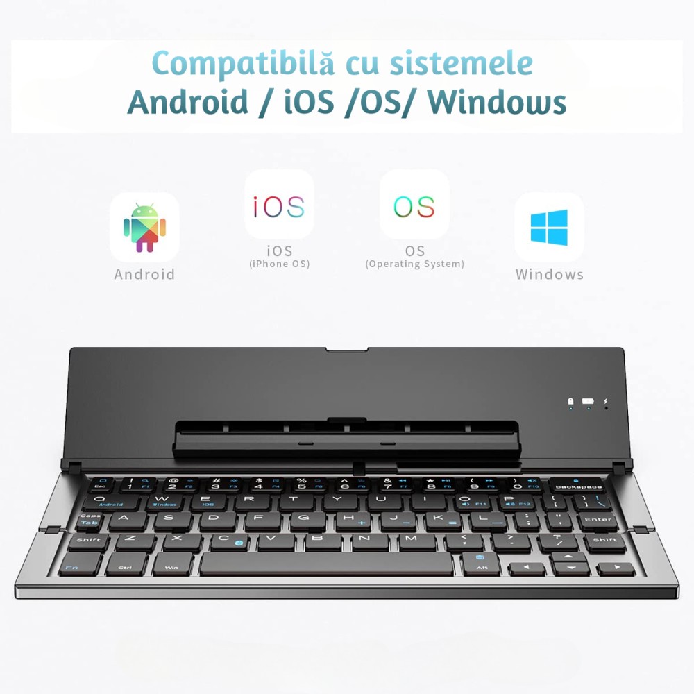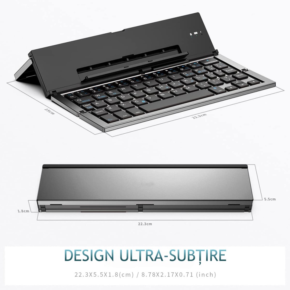 Tastatura Pliabila Super Slim cu Suport pentru Tablete si Telefoane, conectivitate Bluetooth, Compatibila cu Android/iOS/Windows din aliaj de aluminiu