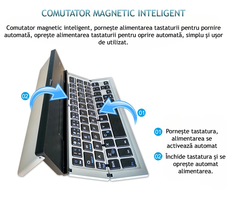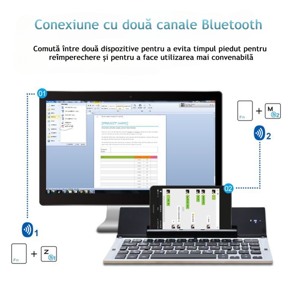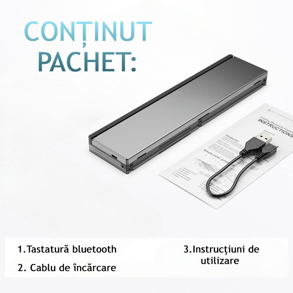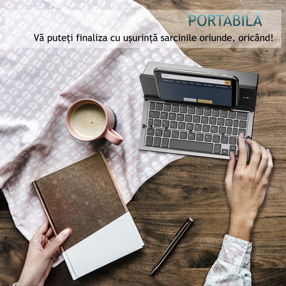 Tastatura Pliabila Super Slim cu Suport pentru Tablete si Telefoane, conectivitate Bluetooth, Compatibila cu Android/iOS/Windows din aliaj de aluminiu