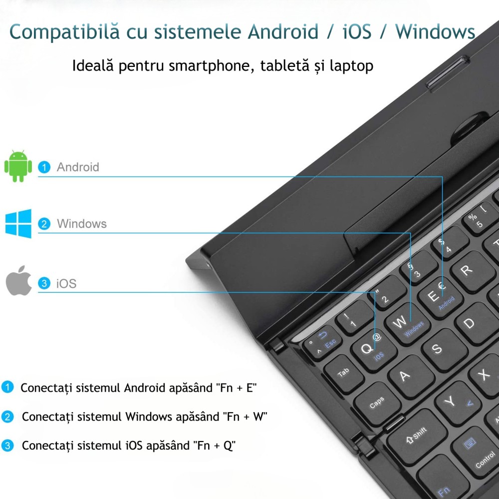 Compatibila cu sistemele Android / iOS / Windows- Indiferent de sistemul de operare pe care il utilizati, aceasta tastatura pliabila Ventlex® poate fi conectata si utilizata fara probleme cu dispozitivele dvs. Android, iOS si Windows, oferindu-va o experienta de tastare consistenta.