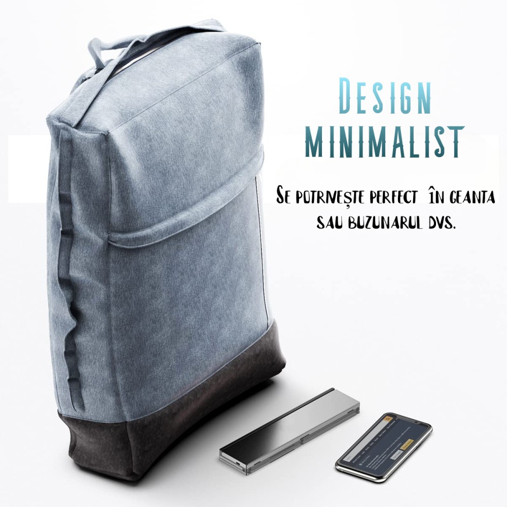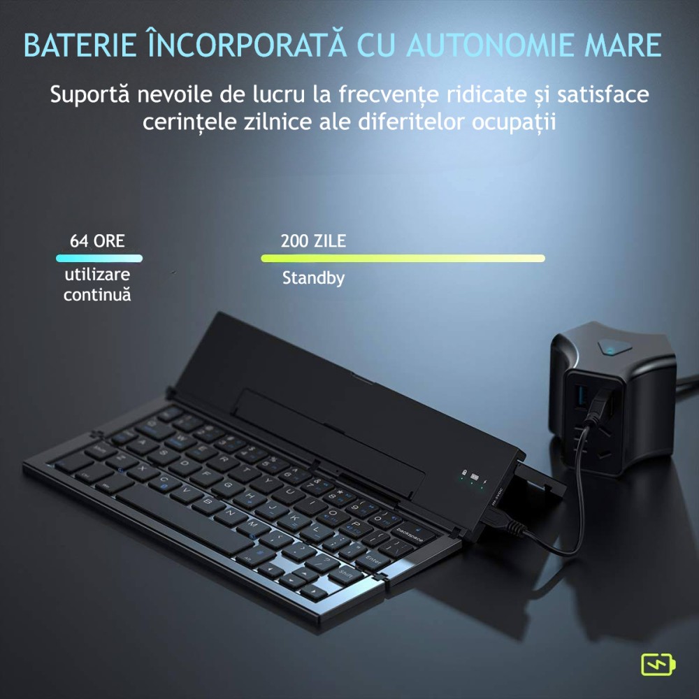 Tastatura bluetooth cu pliere tripla Ventlex®- Beneficiati de o tastatura compacta si portabila, care se pliaza in trei parti, oferindu-va flexibilitate maxima in utilizare si stocare. Durata mai lunga de viata a bateriei, compatibilitate larga, doua canale Bluetooth, pliere tripla si dimensiuni minimaliste, toate sunt special concepute pentru o utilizare zilnica fiind usoara si portabila.