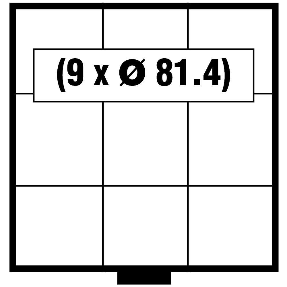 Pentru 9 monede cu diametrul de pana la 81.4mm Inaltimea maxima de umplere: 9mm, adica potrivita si pentru monede in capsule Insertie din pasla albastra nr. 6213 si nr. 6243 pentru etichete de inscriptionare.
