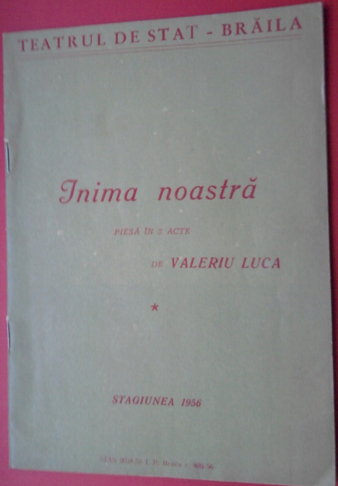 Teatrul de Stat Braila, pliant Valeriu Luca ”Inima noastra”,anul 1956 dedicatie