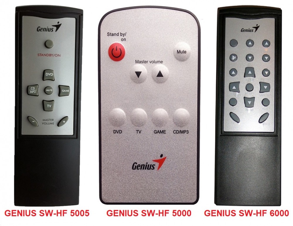 In prima imagine sunt prezentate telecomenzile Genius SW-HF5.1 5000, 5005 si 6000 doar pentru o identificare vizuala, corecta a acestora. Exista insa pe stoc si se poate livra doar telecomanda din imaginea a II-a, telecomanda ce inlocuieste telecomenzile din prima imagine.