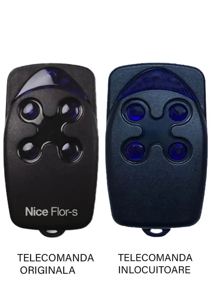 Telecomanda poarta garaj radio cu 4,5 milioane de combinatii Nice Flo 4 R-SSistem cu cod dinamic de 433.92MHz cu autoinvatare si cod secvential pentru inserare multipla (Flor-sc) compatibila cu originalul (838). Produsul disponibil spre vanzare este telecomanda inlocuitoare, cea din partea dreapta a imaginii. Telecomanda originala, afisata in stanga, este prezentata doar cu titlu de referinta, pentru a arata compatibilitatea. Modelul de telecomanda inlocuitoare functioneaza perfect si este compatibil cu varianta originala. Telecomanda compatibila pentru poarta garaj radio cu 4,5 milioane de combinaţii – Nice Flo 4 R-S Sistem cu cod dinamic de 433,92 MHz, cu autoînvăţare și cod secvenţial pentru inserare multiplă (Flor-sc). Produsul inlocuitor al telecomenzii originale, pentru mai multe detalii va rugam sa ne contactati.